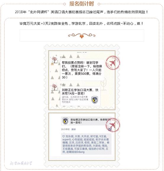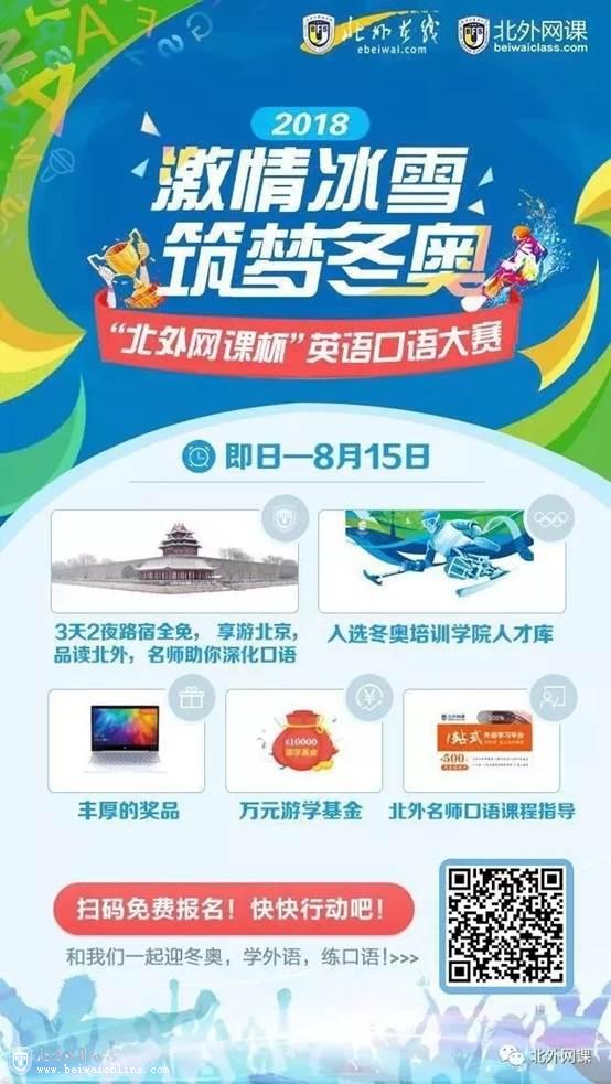 2018年“北外网课杯”英语口语大赛报名通道开启倒计时,本次大赛由北京外国语大学网络教育学院主办,北京体育大学冬奥培训学院为战略合作单位,北外在线(北京)教育科技有限公司承办,外语教学与研究出版社、北京海淀区文化创意产业协会、北京市外办、中国移动和教育、大学生杂志、搜狐、北京电视台和北外在线企业学院共同支持。